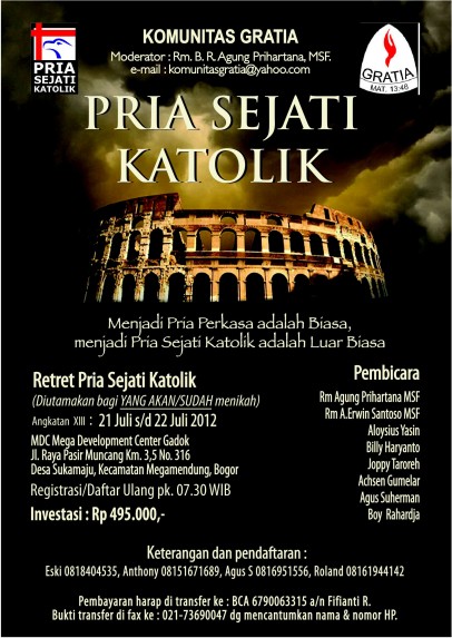 Saya sdh dibantu oleh bp Aloysius Yasin untuk daftar,tapi saya dng ini kirim konfirmasi lagi agar lebih pasti nama saya didaftarkan pada Retret Pria sejati katolik. Periode XIII,21-22 juli2012.
